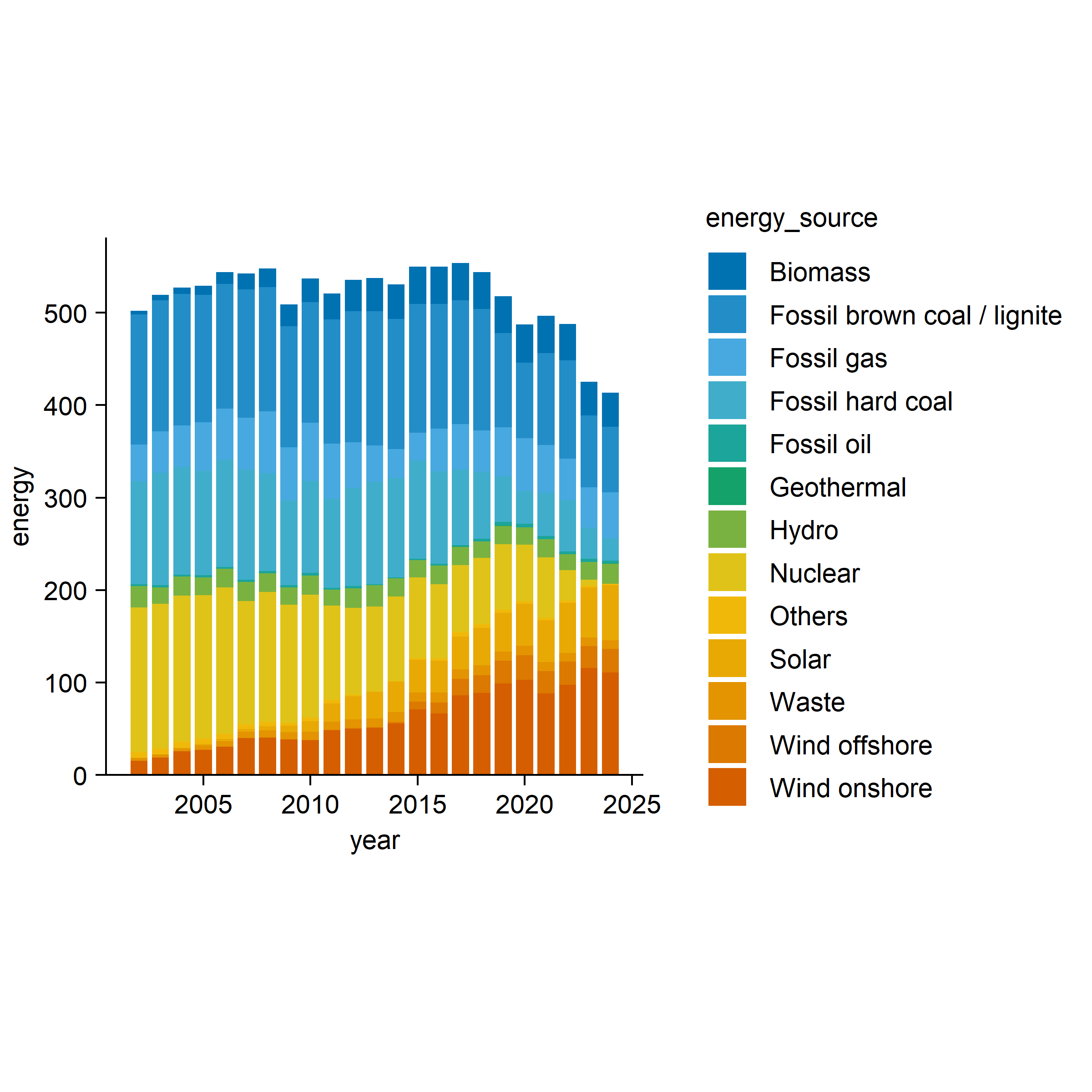 tidyplot(x = year, y = energy, color = energy_source) |>
